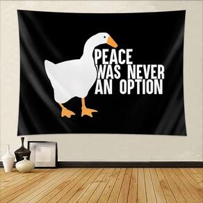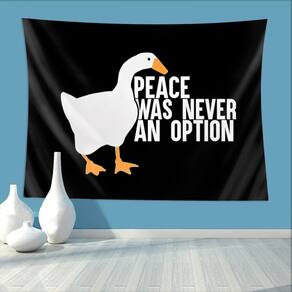 Material: pele de pêssego Tamanho: 150 cm × 130 cm Peso: 260 g 🦆 Humorous Goose Design — Apresenta uma estampa ousada de ganso com a frase engraçada “A paz nunca foi uma opção”, criando uma decoração de parede divertida e atraente. Arte em estilo meme — perfeita para adicionar humor e personalidade ao seu quarto, dormitório ou sala de estar, iniciando uma conversa instantânea. 🧵 Tecido de poliéster durável — Feito de poliéster leve de pele de pêssego, macio e resistente a rugas, com impressão nítida e cores vibrantes resistentes ao desbotamento. Decoração artística de parede versátil — Adequada para dormitórios, quartos, salas de estar ou escritórios; também funciona como tapeçaria, pano de fundo ou decoração inovadora para festas. Tamanho grande e fácil de cuidar — mede 150 x 130 cm (59 x 51 polegadas), simples de pendurar com ganchos ou pregos; lavável à máquina, de secagem rápida e de longa duração para uso repetido.