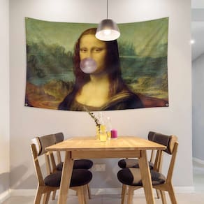 Tamanho: 100 x 150 cm Peso: 110 g Material: poliéster Embalagem: 1 x tapeçaria Esta tapeçaria apresenta um toque divertido da pintura clássica de Mona Lisa, com a figura icônica soprando um chiclete, adicionando um toque divertido e moderno à arte tradicional para a decoração de sua casa ou escritório. Feita de tecido 100% poliéster, esta tapeçaria é macia, durável e se encaixa perfeitamente na parede, oferecendo uma peça elegante e peculiar, perfeita para quartos, salas de estar ou estúdios de arte. A impressão em alta definição garante que as cores vibrantes e os detalhes permaneçam nítidos e vivos, dando vida a essa obra de arte contemporânea. Um ótimo começo de conversa e uma peça de decoração exclusiva. Ideal para amantes da arte e da decoração peculiar, esta tapeçaria adiciona um toque moderno às obras de arte clássicas. Também é um presente perfeito para quem gosta de combinar cultura com humor e criatividade. Fácil de pendurar com alfinetes ou tachas decorativas, esta tapeçaria é simples de manter. Lave à mão com cuidado ou a seco, e você pode passar a ferro em fogo baixo para mantê-la fresca e sem rugas.