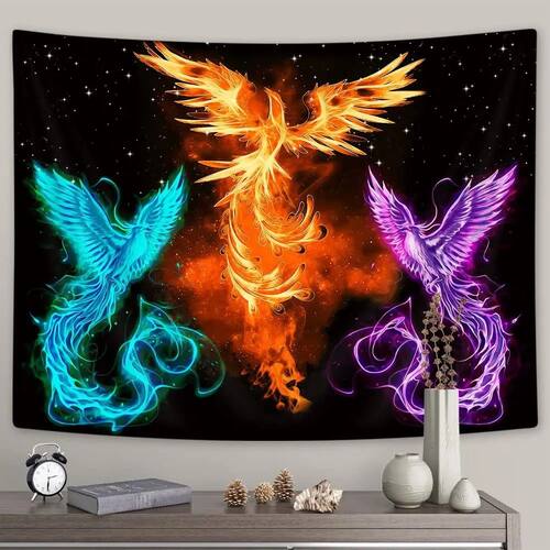 Material: fibra química Tamanho: 150 cm × 130 cm Peso: 200 g Obra de arte de Fantasy Phoenix: apresenta três pássaros fênix em tons de laranja ardente, azul gelado e roxo místico, simbolizando renascimento e poder contra um céu negro estrelado. Tecido de poliéster durável: feito de fibra sintética leve, macio, resistente a rugas e fácil de limpar, garantindo cores vivas e uso a longo prazo. Tamanho de parede perfeito: medindo 150x130 cm, esta tapeçaria é adequada para quartos, salas de estar, dormitórios ou espaços criativos, adicionando um toque mágico e artístico. Fácil de pendurar: as bordas reforçadas facilitam a suspensão com ganchos, pregos ou pinos, permitindo opções flexíveis de decoração. Decoração artística de parede versátil: aprimora interiores inspirados na fantasia, salas boêmias, áreas de meditação ou serve como um cenário exclusivo de fotografia e streaming.