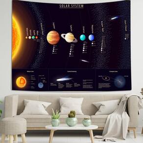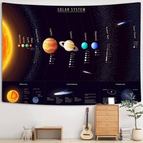 Material: fibra de poliéster (poliéster) Tamanho: 150 cm × 130 cm Peso: 260 g Design do sistema solar Com o sol, planetas, cinturão de asteróides e cometas, esta tapeçaria fornece um gráfico cósmico detalhado que inspira curiosidade sobre astronomia e ciência. Tecido de poliéster durável Feito de fibra de poliéster macia, leve e resistente a rugas, esta tapeçaria é fácil de pendurar, dobrar e armazenar sem perder a forma. Decoração educacional de parede Perfeita para salas de aula, quartos infantis ou áreas de estudo, esta tapeçaria funciona como auxiliar de ensino e tapeçaria decorativa na parede. Tamanho generoso Medindo 59 x 51 polegadas (150 x 130 cm), ele cobre uma grande seção da parede e traz uma peça central vibrante inspirada na astronomia para o seu espaço. Fácil de cuidar. Lavável à máquina em um ciclo delicado com água fria; mantém cores vivas e impressões nítidas após lavagens repetidas, tornando-o adequado para uso a longo prazo.