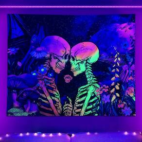 Material: fibra de poliéster (poliéster) Tamanho: 150 cm × 130 cm Peso: 400 g Design exclusivo para amantes de esqueletos: apresenta um casal esquelético brilhante segurando uma rosa, aprimorado com cores fluorescentes de néon para uma aparência ousada e artística. Efeito Glow in Blacklight: impressionante obra de arte alegre que brilha sob luz ultravioleta, criando uma atmosfera psicodélica e gótica em qualquer ambiente. Tecido de poliéster durável: material leve, resistente a rugas e de longa duração o torna perfeito para uso repetido como decoração de arte de parede. Tamanho grande 150x130cm: ideal para cobrir paredes de dormitórios, quartos ou salas de estar, transformando paredes simples em vibrantes exibições artísticas. Fácil de pendurar e cuidar: simples de pendurar com ganchos, pregos ou fita adesiva, dobra para armazenamento e lavável à máquina para facilitar a limpeza e manutenção.