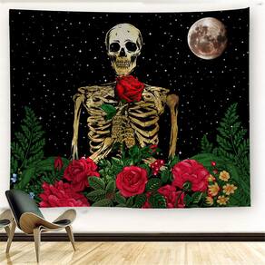 Material: fibra de poliéster (poliéster) Tamanho: 150 cm × 130 cm Peso: 180 g Design gótico romântico — Apresenta um esqueleto segurando uma rosa vermelha sob um céu estrelado com a lua, cercado por flores e folhas vibrantes para um visual marcante. Tecido de poliéster durável — Feito de poliéster leve, macio, resistente a rugas e duradouro, garantindo uma impressão vívida e fácil de cuidar. Decoração versátil — perfeita para uso como decoração de parede, divisória de quarto, fundo de cabeceira ou fundo fotográfico para quartos, dormitórios e apartamentos criativos. Fácil de pendurar e limpar — Simples de montar com ganchos, clipes ou pregos; lavável na máquina em um ciclo delicado, secagem rápida e reutilizável para uso prolongado. Tamanho decorativo grande — mede 150 x 130 cm, oferecendo excelente cobertura de parede para transformar instantaneamente seu espaço em uma cena romântica de inspiração gótica.