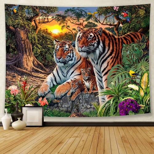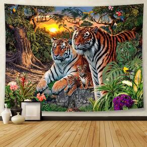 Material: flanela Tamanho: 150 cm × 130 cm Peso: 290 g Impressionante design de tapeçaria com uma família de tigres em um cenário de selva com plantas tropicais e um fundo brilhante ao pôr do sol. Feito de tecido de veludo macio com impressão vívida de alta definição, durável, leve e fácil de pendurar. Uso multifuncional como tapeçaria de parede, decoração de arte de parede, cortina, colcha ou cenário fotográfico. Perfeito para quarto, sala de estar, dormitório ou estúdio criativo, criando uma atmosfera calorosa e exótica de vida selvagem. Mede 150x130cm, lavável, reutilizável e fácil de manter, o que a torna uma peça decorativa de longa duração.