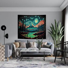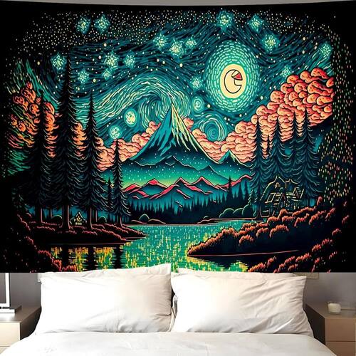 Material: pele de pêssego Tamanho: 150 cm × 130 cm Peso: 260 g Psychedelic Night Design Tapeçaria vívida com uma paisagem montanhosa sob um céu estrelado com lua, floresta, lago e cabanas, adicionando uma atmosfera sonhadora e artística ao seu quarto. Tecido de pele de pêssego de alta qualidade Feito de material macio de poliéster e pele de pêssego, leve, durável, resistente a rugas e à prova de desbotamento para clareza e cor duradouras. Decoração artística de parede versátil, perfeita para quartos, salas de estar, dormitórios, áreas de meditação ou como pano de fundo para festivais de música, espaços criativos ou fotografia. Tamanho grande e fácil de cuidar. Mede 59 x 51 polegadas, ampla cobertura para paredes. Lavável à máquina, de secagem rápida, dobrável e fácil de pendurar ou guardar. Boho & Trippy Aesthetic reúne cores fortes e elementos cósmicos surreais, criando uma atmosfera boêmia e psicodélica única para interiores modernos.