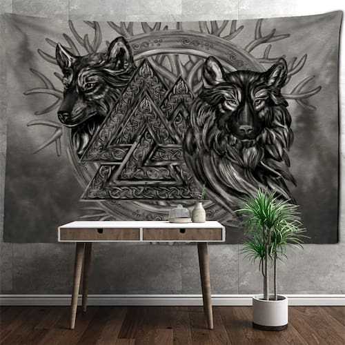 Material: fibra química Tamanho: 150 cm × 130 cm Peso: 200 g Design de mitologia nórdica: apresenta duas ilustrações detalhadas de lobo com nós de Valknut e símbolos inspirados em runas, perfeitas para criar uma atmosfera mística e gótica. Tecido de poliéster durável: feito de fibra sintética de qualidade, macio, leve e resistente a rugas, ideal para decoração de casa a longo prazo. Tamanho perfeito para decoração: medindo 150 x 130 cm, adequado para quartos, salas de estar, dormitórios, estúdios ou como um fundo fotográfico impressionante. Fácil de instalar: as bordas reforçadas permitem pendurar facilmente usando pregos, pinos ou ganchos, oferecendo opções de exibição flexíveis. Decoração artística de parede versátil: funciona bem em interiores góticos, nórdicos ou boêmios e aprimora salas temáticas, áreas de meditação ou cenários artísticos.