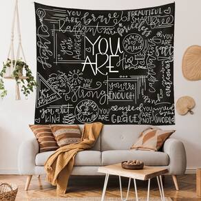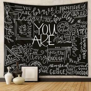 Material: flanela Tamanho: 130 cm × 150 cm Peso: 290 g Design de mensagem poderoso: apresenta citações inspiradoras e motivacionais como “Você é forte”, “Você é linda” e “Você é suficiente” para inspirar confiança e positividade em qualquer espaço. Material de veludo premium: feita de tecido de veludo macio e durável, esta tapeçaria adiciona um toque de luxo ao seu quarto enquanto exibe texto branco claro e ousado em um fundo preto. Ideal para qualquer ambiente: perfeita para quartos, salas de estar, dormitórios ou como pano de fundo para espaços de trabalho criativos, essa tapeçaria traz uma atmosfera moderna e inspiradora a qualquer ambiente. Tamanho perfeito: com dimensões de 130 x 150 cm, ele se encaixa bem na maioria das paredes, tornando-o uma excelente peça de destaque sem sobrecarregar seu ambiente. Fácil de pendurar e manter: leve e simples de pendurar com pregos ou ganchos, esta tapeçaria também é lavável à máquina para facilitar a manutenção e diversão a longo prazo.