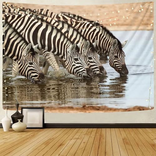 Material: Fibra química Tamanho: 150 cm × 130 cm Peso: 200 g Zebra Wildlife Design Com zebras realistas bebendo água na margem do rio, esta tapeçaria traz a beleza da vida selvagem africana para o seu espaço com elegância natural. Tecido de poliéster premium Feito de fibra de poliéster leve e durável, a tapeçaria é macia, resistente a rugas e fácil de pendurar com ganchos, clipes ou pregos. Decoração de parede versátil. Ideal para quarto, sala de estar, dormitório ou escritório, pode ser usada como decoração de parede, divisória de quarto, cortina de teto ou cenário fotográfico. Tela de tamanho grande, medindo 59 x 51 polegadas (150 x 130 cm), esta tapeçaria oferece uma peça central impressionante que aprimora os temas de safári ou de ambientes inspirados na natureza. Fácil de cuidar e manter. Lavável à máquina em água fria em um ciclo suave, garantindo uma cor vibrante de longa duração e fácil manutenção para o uso diário.