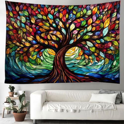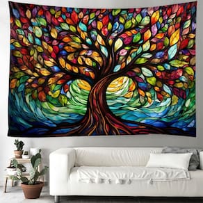 Material: fibra de poliéster (poliéster) Tamanho: 150 cm × 130 cm Peso: 200 g Tapeçaria vibrante com design Tree of Life com uma árvore inspirada em vitrais, com folhas coloridas de arco-íris e padrões intrincados, adicionando energia e criatividade a qualquer ambiente. Tapeçaria de parede versátil Ideal para quartos, salas de estar, dormitórios ou espaços de ioga e meditação, esta tapeçaria funciona como decoração artística de parede, pano de fundo ou divisória de quarto. Tecido de poliéster durável Feita de poliéster leve, a tapeçaria é macia, resistente ao desbotamento e projetada para uso decorativo de longa duração em ambientes fechados. Tamanho generoso Medindo 150 x 130 cm, oferece excelente cobertura como arte de parede ou fundo decorativo, aprimorando espaços com estética boêmia ou artística. Fácil de cuidar Resistente a rugas e lavável na máquina para facilitar a limpeza; dobrável e portátil para fácil armazenamento e reutilização.