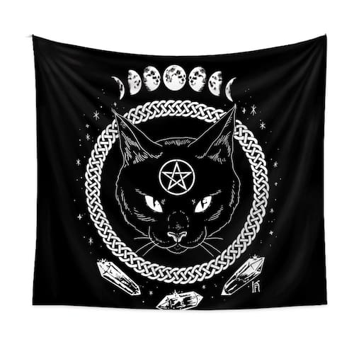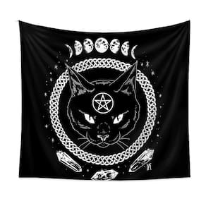 Material: fibra de poliéster (poliéster) Tamanho: 150 cm × 130 cm Peso: 290 g Design de gato místico: apresenta um gato preto com pentagrama, cercado por fases da lua, cristais e estrelas, criando uma estética gótica inspirada na feitiçaria. Tecido de poliéster durável: feito de poliéster leve e resistente a rugas, macio, forte e adequado para decoração de parede de longo prazo. Decoração artística de parede versátil: funciona como tapeçaria, tapeçaria ou pano de fundo, perfeita para quartos, salas de estar, dormitórios ou espaços de meditação. Tamanho grande 150x130cm: oferece excelente cobertura para decoração de parede, tornando-se uma peça central atraente para os amantes da estética sombria. Fácil de pendurar e manter: pode ser pendurado com pregos, ganchos ou tiras adesivas; dobra para facilitar o armazenamento e é lavável à máquina para uma limpeza sem complicações.
