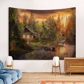 Material: pelúcia curta Tamanho: 150 cm × 130 cm Peso: 300 g Design inspirado na natureza: apresenta uma tranquila cabana na floresta à beira de um lago com céu brilhante ao pôr do sol, pinheiros exuberantes e um riacho, adicionando uma atmosfera rústica e relaxante a qualquer espaço. Material de pelúcia curta premium: feito de tecido de pelúcia curto macio e durável, proporcionando uma textura aconchegante, cores vibrantes e qualidade de impressão duradoura que aprimora a decoração da arte da parede. Decoração de quarto versátil: ideal como decoração de parede no quarto, sala de estar, dormitório ou estúdio; também pode ser usada como pano de fundo, colcha, sofá ou fundo decorativo para fotografia. Tamanho perfeito: mede 150 x 130 cm, o que o torna adequado para espaços de parede pequenos e médios; leve e fácil de pendurar, dobrar e guardar quando não estiver em uso. Fácil cuidado e manutenção: lavável à máquina em um ciclo delicado com água fria; a impressão resistente ao desbotamento garante que a tapeçaria mantenha sua beleza natural ao longo do tempo.