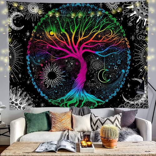 Material: pelúcia curta, faixa de luz Tamanho: 150 cm × 130 cm Peso: 290 g Design vibrante da Árvore da Vida — tapeçaria deslumbrante com uma árvore da cor do arco-íris cercada por elementos celestes como lua, sol e estrelas, criando uma vibração cósmica mágica. Material de pelúcia macio — Feito de tecido de pelúcia curto premium, macio ao toque, durável e resistente a rugas, com impressão brilhante e vívida para uma decoração de arte de parede atraente. Tamanho decorativo perfeito — mede 150 x 130 cm, ideal para cobrir paredes de quartos, dormitórios, espaços de meditação ou salas de estar para criar uma atmosfera aconchegante e mística. Vem com luzes decorativas — Inclui luzes de corda LED para aprimorar o efeito de brilho da tapeçaria à noite, tornando-a perfeita para reformas estéticas de ambientes. Fácil de pendurar e manter — Leve e fácil de instalar com ganchos ou clipes. Lavável à máquina em água fria para uso duradouro e limpeza conveniente.
