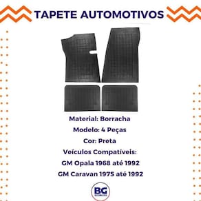 Tapete de Borracha GM Opala 1968 até 1992 Caravan 1975 até 1992 4 Peças- Carfloor -marca: Carfloor -código do Fabricante: D0250 -modelo: 4 Peças 02 Peças Dianteiras e 02 Peças Traseiras -material: Borracha -cor: Preto -jogo de tapete borracha