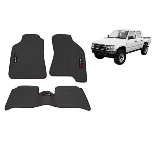 Tapete Hilux com traseiro inteiriço Anos 1998 a 2004 PVC Frisado Ilhós de segurança para melhor fixação Sem odor Base antiderrapante Impermeável Lavável e de fácil limpeza Bordado em todas as peças Encaixe perfeito no seu veículo Modelo personalizado para cobrir o apoio do pé esquerdo