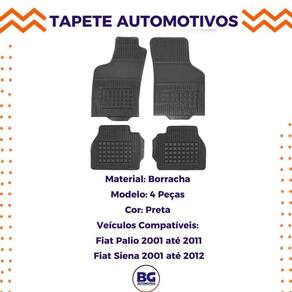 Tapete de Borracha Fiat Palio 2001 até 2011 / Siena 2001 até 2012 4 Peças- Carfloor -marca: Carfloor -código do Fabricante: D0430 -modelo: 4 Peças 02 Peças Dianteiras e 02 Peças Traseiras -material: Borracha -cor: Preto -jogo de tapete borracha
