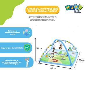 Quando aberto, o tapete mede 85 x 85 x 50 cm, oferecendo um espaço amplo e confortável para o bebê brincar. Equipado com duas barras e cinco brinquedos de pelúcia em forma de animais, cada um com papel de ruído, ele incentiva a interação e a curiosidade do bebê.