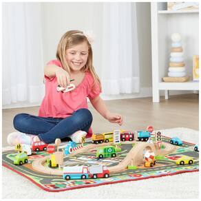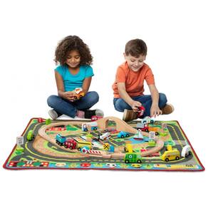 O tapete de atividades multiveículos Deluxe é perfeito para criar um mundo de aventuras sem fim Com 19 veículos, incluindo 13 rodoviários, um helicóptero e um barco, você pode visitar uma estação de trem, corpo de bombeiros, escola, mercado, hospital, centro de reciclagem, lago e muito mais no tapete ilustrado. Além disso, o conjunto inclui 12 sinais de trânsito de madeira que podem ser organizados e reorganizados.