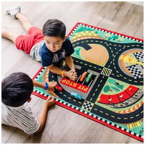 Este tapete de corrida é perfeito para crianças em idade pré escolar, de 3 a 5 anos, que adoram brincadeiras imaginativas e sem tela. Feito de tecido resistente e durável, o tapete possui um design de pista de corrida com um pit stop, círculo de vencedores, arquibancadas e uma área de escoamento para acomodar todos os tipos de veículos, pessoas brincando, tráfego sinais e muito mais Além disso, o tapete vem com quatro carros de corrida de madeira coloridos e vagas de estacionamento numeradas para adicionar contagem e diversão sequencial. O material durável é lavável à máquina e o suporte antiderrapante é seguro em todas as superfícies do piso. Com um formato extragrande, é grande o suficiente para várias crianças e muitos carros. Este produto é enviado em sua própria embalagem especial de comércio eletrônico, projetada para ser mais fácil de abrir e reduzir o desperdício.
