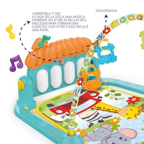 Tapete de Atividades com Piano Musical Joy da Replay Kids - AmigosA Replay Kids desenvolveu novos tapetes com estampas divertidas, coloridas e lúdicas para o seu bebê, além de um duplo acolchoado, deixando seu bebê confortável em qualquer posição.Os brinquedos coloridos e cheio de texturas estimulam o tato e a coordenação motora. E o piano musical traz luzes e sons divertidos que aprimoram as habilidades auditivas do seu bebê, além de proporcionar a criatividade e percepção visual com diferentes cores, luzes e músicas.Atenção Nunca deixe a criança brincar sozinha sem a supervisão de um adulto.Principais Características:- Idade Recomendada: +2 até 18m- O piano acompanha o crescimento do bebês com músicas e interação.- Percepção Visual: Reconhecimento de diferentes formas e cores- Desenvolvimento Tátil: Os brinquedos pendurados e o piano na base promovem o desenvolvimento muscular dos braços e pernas do bebê- Coordenação Motora: Aos 6 meses o bebê já começa a ficar sentado, treinando a capacidade motora e flexibilidade com os brinquedos- Desenvolvimento Auditivo: As teclas do piano tocam diferentes sons e melodias, estimulando a audição dos pequenos.- Funções de Liga / Desliga- Dimensões do Produto Aberto LxCxH : 70 x 56 x 40 cm- Dimensão do Tapete LxC 45 x 70- Dimensões da Caixa LxHxP : 45 x 32 x 8 cm- Alimentação: 2 Pilhas AA Não inclusas Especificações Técnicas:- Conteúdo da Embalagem: 1 Tapete, 1 Arco, 1 Piano Multifunção, 4 Brinquedos- Garantia: 30 Dias Contra Defeito de Fabricação - Certificação: 006612/2022 - Portaria 302/21 - OCP 0061- referência do Fabricante: 21452- EAN: 7899403214526- Marca: Replay Kids Fotos Ilustrativas Cores e Modelos podem mudar conforme o lote de fabricação.