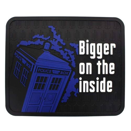 - O tapete apresenta a máquina do tempo do médico, o Tardis, com o texto "Maior no interior".