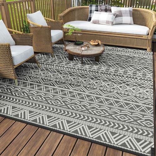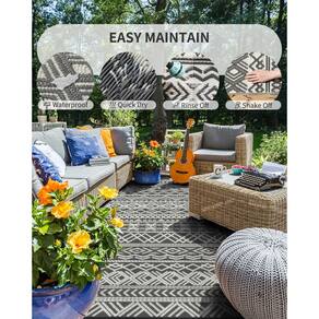 Quatro tamanhos disponíveis: 5 x 8 pés, 6 x 9 pés, 9 x 12 pés, 9 x 18 pés Três cores disponíveis: cinza, azul marinho, preto marrom, marrom bege Tapete versátil para uso interno e externo que pode ser amplamente utilizado como tapete de pátio, tapete de trailer, tapetes de acampamento para fora do trailer, tapetes de deck para uso externo à prova d'água. Tapete Boho ao ar livre como ótima decoração de pátio, decoração de varanda, decoração de varanda externa, decoração de deck ao ar livre, decoração de acampamento para campista. Tapete externo impermeável e barato que o campista deve ter e os acessórios de praia essenciais - Reversível e versátil: um tapete reversível intercambiável e econômico oferece cor e personalidade ao seu espaço interno e externo sem distrair de outras decorações. O tapete Boho com design geométrico moderno e versátil pode ser uma ótima decoração de pátio externo, decoração de varanda. - Resistente a manchas e secagem rápida: tapete de palha de plástico reciclado para exterior de fácil limpeza, impermeável, resistente a manchas e de secagem rápida. Sujeira, cabelo e respingos podem ser facilmente removidos por pulverização ou agitação de água. Opções perfeitas para serem colocadas ao ar livre o tempo todo, como tapete de pátio externo, tapete de varanda ou tapete de piscina ao ar livre. Também é um tapete de praia impermeável sem areia, tapete de acampamento ao ar livre, tapete de piquenique ou tapetes para trailers ao ar livre. - Durável e resistente ao desbotamento: o revestimento UV externo do tapete reduz os possíveis danos causados pela luz solar, como desbotamento ou envelhecimento. A borda termoplástica com encadernações pode evitar desgaste e rasgos. Tapete externo à prova de intempéries que sobrevive a qualquer elemento, tráfego e arranhões sem perder sua cor ou textura com o tempo. - Macio e confortável: o tapete externo, tecido com canudos de plástico tubulares e antialérgicos, é macio e acolhedor sob os dedos dos pés e joelhos. O confortável tapete de convés protege seu piso de madeira contra arranhões nos móveis e tráfego intenso de pés e patas. Um ótimo tapete de acampamento para trailers nunca danifica a grama. - Leve e amplo uso: é tecido com canudo de plástico leve com várias linhas de dobra, para que este grande tapete externo possa ser facilmente dobrado e embalado para passeios, piqueniques, banhos de sol e viagens de trailer. Acessórios utilitários de acampamento e acessórios de acampamento para trailers de viagem. 5 x 8 pés não incluem bolsas de transporte e estacas para tapetes.