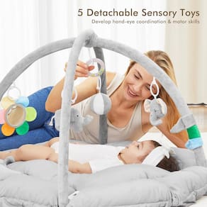 5 BRINQUEDOS DESTACÁVEIS: A academia de atividades para bebês tem 5 brinquedos sensoriais coloridos e 5 pendurados para estimular a visão, a audição e o tato do bebê e promover suas habilidades motoras e a coordenação olho-mão.