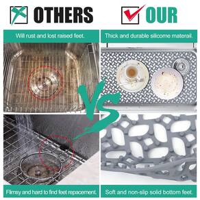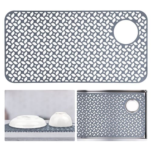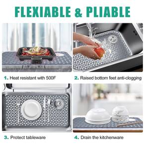 Apresentamos o tapete de silicone para pia da JUSTOGO , um acessório essencial para sua cozinha. Medindo 71 cm x 35 cm, este tapete foi projetado para caber na maioria das pias de cozinha, oferecendo excelente proteção para a superfície da sua pia. Feito de silicone flexível e flexível, é à prova de ferrugem, resistente ao calor até 500F e amortece forças repentinas para proteger seus pratos frágeis. O design sólido do tapete com pés elevados permite uma drenagem eficiente e fácil limpeza na máquina de lavar louça. Sua característica antiderrapante garante que ele permaneça no lugar, enquanto os padrões irregulares retêm resíduos de alimentos de forma eficaz. O pacote inclui um tapete de pia e está disponível em cinza. Observe que, devido ao seu design, o tapete pode ser um pouco difícil de limpar. Recomendamos levá-lo para limpeza periódica para manter seu desempenho. - ?Material de silicone? Este tapete de pia de silicone é à prova de ferrugem, flexível e flexível, amortece a força repentina protege seus pratos frágeis, se adapta perfeitamente ao lado da pia. Um bom tapete de pia e protetores para seus frágeis copos e pia de aço inoxidável/cerâmica. - ?Resistente ao calor?Nossos tapetes e protetores de pia podem suportar até 500F, você pode colocar com segurança panelas e pratos na pia ou bancada de porcelana diretamente do forno/fogão. Também use como uma grade de secagem, escorredor de louça, escorredor de louça, rack de resfriamento, grade de descongelamento, etc - ?Pés inferiores sólidos e elevados? Pés antiderrapantes e elevados elevam os tapetes da pia da cozinha com orifício de drenagem, permitem que partículas de alimentos e água corram através dele. Também funciona como um tapete de secagem de louça embaixo da pia. Grade de pia de cozinha com abertura para o ralo da pia, serve para pias sigle/tigela dupla com drenos laterais. - ?Lavagem na máquina de lavar louça?O material de silicone é lavável na lava-louças, fácil de limpar. Limpar protetores de pia para pia de cozinha com água corrente também é uma boa maneira. Outro benefício do material de silicone é à prova de ferrugem, fácil de limpar. - ?Tamanho do produto?Tamanho: 71 x 36 cm. Embalagem: 1 x tapete de pia de silicone. Os padrões irregulares projetados mantêm os resíduos de alimentos de forma eficaz, mas um pouco difíceis de limpar. Recomenda-se que os tapetes e protetores de pia da cozinha façam uma limpeza peridical.