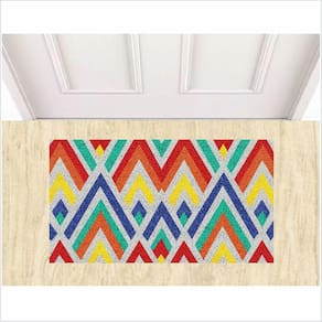 Tapete tipo Capacho Vinil com fibras entrelaçadas e costado emborrachado com arte pinta em tinta vinílica especial.