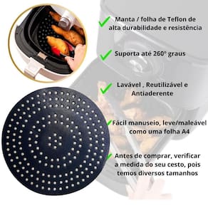 Tapete folha de teflon para fritadeira air fryer redondo 20 cm a folha de teflon para cesto fritadeira air fryer é a solução perfeita para diversas marcas e modelos, facilita o preparo dos seus alimentos na air fryer. Com essa manta de teflon resistente, maleável e super prática de usar, você terá mais facilidade e praticidade na hora de cozinhar. Proteja o cesto da sua air fryer contra resíduos e alimentos que possam grudar durante o processo de cozimento. Com a folha de teflon, você não precisa se preocupar com a limpeza do cesto, pois ela evita que os alimentos grudem, facilitando a remoção dos resíduos. Esse tapete de teflon é ideal para ser utilizado dentro do cesto da air fryer 20 cm. Pode ser utilizado em diversos modelos e pode ser facilmente recortado para se adaptar em vários airfryers, servindo para as marcas mondial, philco, britânia entre outras. A folha de teflon para cesto fritadeira air fryer é reutilizável e lavável, o que significa que você pode usá-la várias vezes sem perder a qualidade. Ela também não transmite odor ou sabor aos alimentos, garantindo que suas refeições fiquem sempre deliciosas. Com medidas aproximadas de 20cm, esse tapete de teflon é compatível com a maioria das air fryers de 3,2l litros, incluindo o modelo mondial, philco, britania, cadence etc. . . Antes de fazer a compra, recomendamos que você verifique o diâmetro interno do cesto da sua air fryer para garantir o encaixe perfeito. O material utilizado na fabricação da folha de teflon para cesto fritadeira air fryer é o teflon, o que confere resistência e durabilidade ao produto. Diferente de tapetes de silicone, esse tapete de teflon possui espessura de uma folha a4, o que permite uma melhor distribuição de calor durante o cozimento dos alimentos. Características técnicas: - contém: 01 unidade - material: teflon - medidas: 20 cm - cor: preto