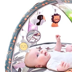 Equipado com duas barras e cinco brinquedos de pelúcia em forma de animais, cada um com papel de ruído, ele incentiva a interação e a curiosidade do bebê.