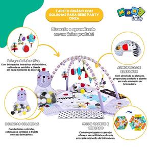 - Conteúdo da Embalagem: 1 Tapete, 2 Arcos, 5 Brinquedos estimulantes 1 Travesseiro em formato de animal, 1 Saco de bolas de caton