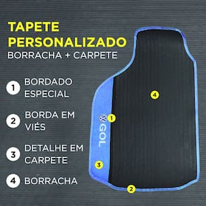 O diferencial desse tapete é a sua personalização. Os tapetes personalizados tem acabamento com detalhe em carpete colorido que deixam o interior do seu carro mais bonito. Acompanha tapete protetor para porta malas em borracha também personalizado.
