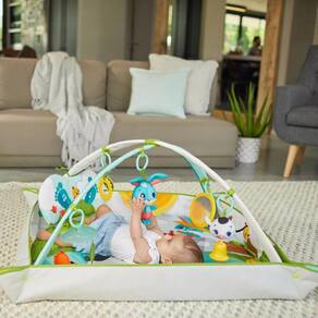 Redesenhado, o Tapete Gymini Kick Play Tiny Farm, apresenta novos personagens amigáveis e divertidos da família Tiny Pioneers, criados para inspirar a exploração e a descoberta na mente em desenvolvimento das crianças.