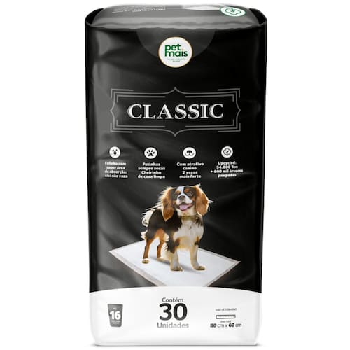 Linha Super Premium, o Tapete Higiênico Classic Petmais 30 unidades possui uma tecnologia responsável por garantir uma ultra absorção, que não permite vazamento e deixa as patinhas de seu pet sempre secas. A sua capacidade de absorção é considerada uma das melhores do mercado, suportando até 3 dias de uso ou até 3 litros de urina, o que equivale a aproximadamente 16 xixis.