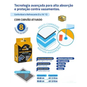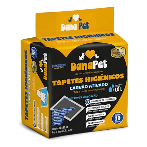 O Tapete Higiênico 60x80cm Carvão Ativado da Dana Pet Super Absorvente é a escolha ideal para quem busca tapete para cachorro de alta absorção, sinônimo de higiene e tecnologia. Com 8 camadas de Proteção, absorção ultra rápida, neutralizador de odores, e com capacidade de absorção até 1,8 litros, é perfeito para cães de pequeno porte, garantindo xixi seco, sem vazamentos, sem mau cheiro e compacto.