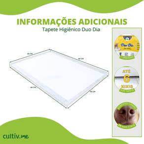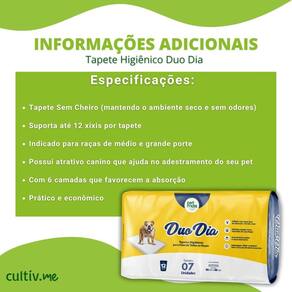 Tapete Higiênico Duo Dia 7 Unidades (85X60) PETMAIS Descrição * O Tapete Duo Dia é a escolha ideal para quem busca um produto de alta performance e durabilidade para a higiene do seu pet. * Com capacidade de absorver até 12 xixis, este tapete higiênico premium foi desenvolvido para garantir um ambiente sempre limpo, seco e confortável para o seu cachorro, evitando vazamentos e mantendo o local sem odores. * Com a melhor tecnologia de absorção, o Tapete Duo Dia oferece durabilidade superior, atendendo pets de diferentes tamanhos, especialmente cães de médio e grande porte. *Ele está disponível em apresentações práticas, que facilitam o uso diário e a reposição. Proporcione ao seu pet o conforto e a higiene de que ele precisa, com a confiança de um produto premium. Características * Medida: 85 cm x 60 cm * Área de Absorção: 75 cm x 55 cm * Camadas: 6 Camadas que garantem total absorção * Porte: Médio e Grande * Suporta: Até 12 xixis por tapete * Material: Celulose, Gel, Plástico * Raças de Cachorro: Todas as Raças A Petmais não se limita a ser apenas uma empresa de produtos para pets. Sua essência reside na capacidade de criar soluções que aproximam animais e seus tutores, transformando a convivência em uma experiência extraordinária. Nós da CULTIV.ME trabalhamos desde 2013 para trazer os melhores produtos ao alcance de todos CULTIV.ME o verde que faltava!