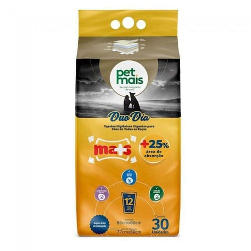 Tapete Higiênico Duo Dia MAIS 85x60 Fardo com 4 Pacotes Manta Absorvente Maior. Ótima opção com melhor custo/ benefício e absorção de até 2 dias. MELHOR CUSTO/ BENEFÍCIO Até 2 dias de absorção. Economia de água e tempo. Dispensa a lavagem diária da área. ATRATIVO CANINO Ajuda no adestramento, estimulando o cão a usar o tapete. FIM DO MAU CHEIRO Gel super absorvente - Absorção mais rápida e eficaz. Elimina odores desagradáveis. NÃO MOLHA AS PATAS Design funcional, distribui a urina facilitando a absorção, evitando que o cão molhe as patas. MAIS ECOLÓGICO Celulose reciclada. Menos árvores retiradas da natureza. FITAS ADESIVAS NO TAPETE Fixam o tapete no lugar desejado, evitando o deslocamento. PARA TODAS AS RAÇAS Pode ser utlizado com cães de qualquer porte. Adultos e filhotes. NÃO VAZA Possui abas nas laterais para contenção de eventuais vazamentos. Especificações - Marca: PetMais - Cod: 010101024 - Quantidade: 30 unidades - Medidas: 85x60 cm - Peso: 3,450 kg - Absorção: até 2 dias Modo de Usar: Para adestrar fihotes e cães que nunca utilizaram tapetes higiênicos, cubra uma área maior do local e retire progressivamente um tapete a cada dia até restar apenas um. O cão entenderá como sendo o local correto para fazer suas necessidades. Posicione o tapete com o filme plástico voltado para baixo. Em local afastado da água e da comida do cão. Para machos adultos, fixe o tapete na parede e no piso formando um ângulo de 90º. Para fêmeas e filhotes, fixe o tapete somente no piso. Prenda as fitas adesivas para maior fixação. Nos primeiros dias, aproxime sempre que possível o cão do tapete para que ele sinta o odor do atrativo canino. O atrativo canino o incentivará a utilizar o tapete. Na fase de adaptação, agrade o cão sempre que utilizar o tapete de forma correta. Caso o pet urine em outro local, leve-o imediatamente para o tapete. Em poucos dias ele criará o hábito de utilizar o tapete higiênico