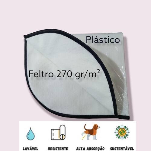 =============================================== Especificação do produto: Fabricação própria, fabricado com duas camadas. A primeira com alta absorção composição: feltro 270 Gr/m, aproximadamente 4 mm de espessura ; A segunda impermeável para retenção da urina, impedindo que vaze para o chão. composição: plástico maleável de 10 mm , com borda viés preto de 22 mm. Produto ecológico e bem mais econômico do que os descartáveis e absorve mais. Parte superior própria para alta absorção. Fácil de usar, apenas passar na água corrente e colocar pra secar. Para os pets macho, orientamos a colocar um cone no centro do tapete. Pode ser utilizado no interior do sanitário canino, não inala odor. Garantimos a qualidade do produto.