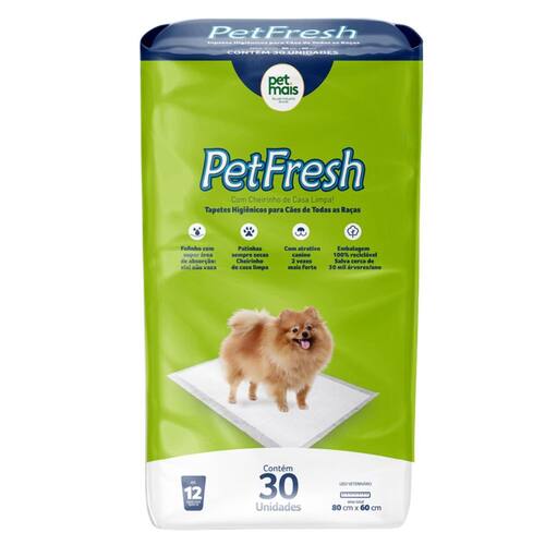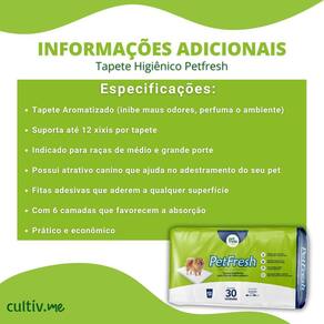 Tapete Higiênico Petfresh 30 UNID (80X60cm) PETMAIS Descrição * O Tapete Petfresh é a escolha ideal para quem deseja uma solução higiênica e prática para o cuidado do seu pet. Sua medidas é ideal para cães de médio e grande porte, oferecendo o tamanho perfeito para a necessidade do seu amigo de quatro patas. * Além da alta absorção, o Tapete Petfresh vem com fragância refrescante, proporcionando um ambiente mais agradável e livre de odores indesejados. Sua composição de materiais de alta qualidade garante eficiência na absorção da urina e controle de odores, mantendo o ambiente do seu pet sempre limpo e perfumado. * Para cachorros macho o tapete deve ser fixado em um angulo de 90º sendo parte na parede e no chão. Para fêmeas e filhotes o tapate deve ser fixado diretamente no chão. * Para garantir a adptação, lembre-se de recompensar seu pet com carinhos e petiscos quando fizer xixi no tapete higiênico. Características * Medida: 80 cm x 60 cm * Área de Absorção: 70 cm x 50 cm * Camadas: 6 Camadas que garantem total absorção * Porte: Médio e Grande * Suporta: Até 12 xixis por tapete * Material: Celulose, Gel, Plástico * Raças de Cachorro: Todas as Raças A Petmais não se limita a ser apenas uma empresa de produtos para pets. Sua essência reside na capacidade de criar soluções que aproximam animais e seus tutores, transformando a convivência em uma experiência extraordinária. Nós da CULTIV.ME trabalhamos desde 2013 para trazer os melhores produtos ao alcance de todos CULTIV.ME o verde que faltava!