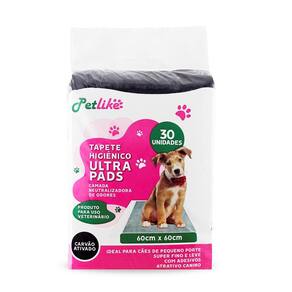 Tapete Higiênico PetLike Ultra Pads Carvão Ativado 60x60cm C/30 Unidades - Indicado para cães; - Com atrativo canino; - Melhor distribuição do xixi; - Barreiras que evitam o vazamento; - Com fita adesiva, melhor fixação. - Camada de carbono neutralizadora de odores; - Tamanho 60 x 60cm. O Tapete Higiênico Pet Like Ultra Pads Carvão ativado é um excelente tapete compacto, indicado para cães de todos os portes. O Tapete Higiênico PetLike Ultra Pads Carbono possui uma camada de carbono neutralizadora de odores, proporcionando o fim do mal cheiro e um agradável aspecto de limpeza. Simples e prático, é elaborado com matérias que garantem uma super absorção. Com barreiras nas laterais de proteção, evita que o xixi vaze. O seu design garante uma melhor distribuição do xixi. Além disso o tapete possui um atrativo canino, facilitando o treinamento do seu pet seja ele filhote ou adulto. Modo de usar: Tire o tapete da embalagem. Desdobre-o. Retire os papéis aplicados nos 4 cantos da parte inferior do tapete e fixe-o no chão com o lado dos adesivos voltados para baixo. Dicas de uso: Para uma adaptação mais rápida, no começo espalhe alguns tapetes nos locais frequentados pelo cão. Após o seu bichinho acostumar-se a fazer xixi no tapete, reduza a quantidade de tapetes gradualmente até que seja necessário manter apenas um tapete por vez no local escolhido para o cão fazer as suas necessidades. Importante: A capacidade de absorção e retenção do líquido poderão variar de acordo com a concentração da urina e umidade do ar. O tapete reduz, mas não elimina o odor no ambiente. A troca do tapete é sugerida quando for visível o encharcamento do produto ou quando o odor estiver forte no ambiente. Composição Filme de polietileno, tecido não-tecido, celulose, papel, polímero super absorvente, carvão ativado, atrativo.