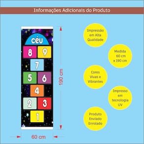 Tapete pedagógico - amarelinha Brincando e aprendendo com a amarelinha A amarelinha é um jogo clássico que desenvolve a coordenação motora, equilíbrio, concentração e raciocínio lógico das crianças. Este tapete pedagógico foi criado para tornar a aprendizagem mais divertida, estimulando habilidades essenciais de forma lúdica e interativa. Como jogar: 1. Jogue uma pedrinha ou marcador na primeira casa. 2. Pule com um pé só nas casas individuais e com os dois pés nas casas duplas. 3. Ao chegar ao final, vire-se e volte pegando a pedrinha. 4. Passe para a próxima casa e continue até completar o percurso. 5. Quem errar passa a vez para o próximo jogador Benefícios do tapete pedagógico: estimula a psicomotricidade e a coordenação corporal. auxilia no aprendizado de números e sequências. incentiva a socialização e o respeito às regras. pode ser em diferentes ambientes sala de aula, recreação, terapias . Dica: varie o jogo adicionando desafios, como pular com os olhos fechados ou contar de trás para frente Vamos pular e aprender juntos Fabricado em lona vinilica com impressão uv Tamanho: 190 x 60 cm Homologação Inmetro: CE-BRI/IQB 002755 54760/21-032