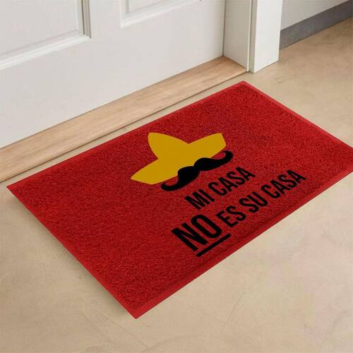 Tapete Mi Casa No Es Su Casa Tapete decorativo para sua casa. Características: Tamanho: 60 Cm X 40 Cm Material: Vinil Personalização: Pintado Cor Do Fundo: Vermelho Borda: Rebaixada 2cm Cor Do Logo: Preto e ouro. Marca: Endereço Do Kapacho Ean: 7908405800245