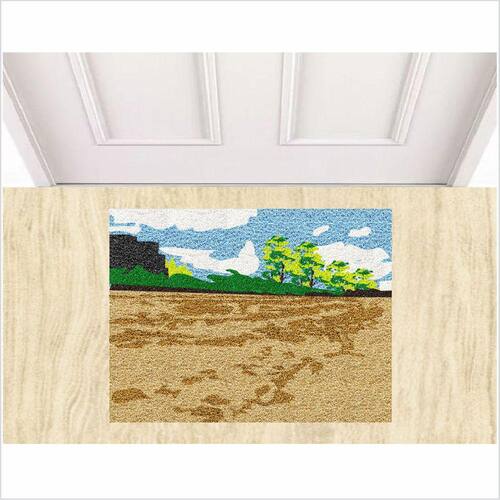 Tapete tipo Capacho Vinil com fibras entrelaçadas e costado emborrachado com arte pinta em tinta vinílica especial.
