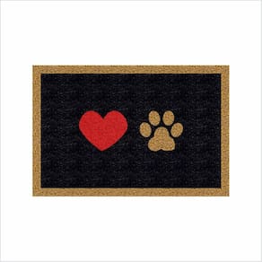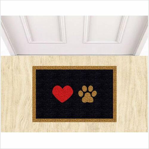 Tapete tipo Capacho Vinil com fibras entrelaçadas e costado emborrachado com arte pinta em tinta vinílica especial.