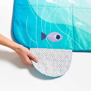 Tapete de atividades tamanho XL, para uso interno e externo. Com base impermeável, 5 atividades e design com efeito aquarela e cores inspiradas no oceano.