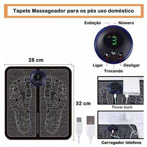 Estilo: A, B opcional Material: PU / SDR Tamanho do pedal: Aprox. 32x30cm / 12.6x11.8in Fonte de alimentação de carregamento: bateria de polímero, modelo PL501240, capacidade 260mAh Características: cuidados com os pés, massagem de pontos de acupuntura, ativar veias, aliviar a fadiga Modos: 6 Marca: Sp All Ean: 7890519000805