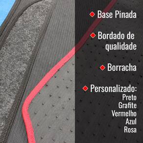 CARACTERÍSTICAS: - Cor: Preto com detalhes em carpete azul, grafite, preto, rosa ou vermelho - Material: PVC com base antiderrapante em PVC pinado - Bordado em carpete com o modelo do carro e/ou emblema da montadora - Impermeável e lavável