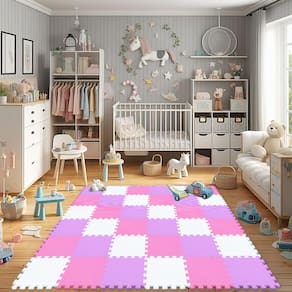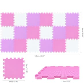 vdf - Tamanho do tapete de espuma – 18 tapetes quadrados interligados de 30 cm x 30 cm, a espessura é de 1 cm, cobrindo uma área de 16 pés quadrados após a montagem. - COR DO PISO PROTETORA - Branco, Rosa, Roxo. O tapete de EVA qqpp é feito de matérias-primas de alta qualidade para garantir a cor e o brilho do produto. - Tapete de segurança – Feito de espuma segura, macia e durável. Livre de BPA, ftalatos, , ecológico e não tóxico. - TAPETE DE INTERLOQUEIO MULTIFUNCIONAL - utilizado para proteger o chão, construir uma área de brincadeiras confortável e segura para bebês, como um tapete de proteção para ioga, exercícios, etc. Adequado para salas de estar, quartos infantis, berçários, ginásios, garagens, porões, etc. - Fácil de limpar e montar – pode ser facilmente limpo com um pano úmido e sabão neutro, a função de intertravamento e portabilidade tornam muito fácil de montar.