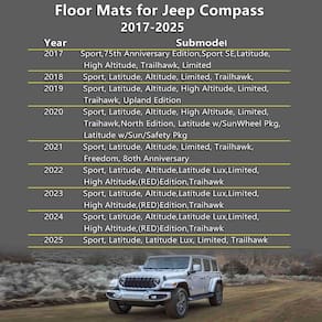 Conjunto de tapetes de chão de ajuste personalizado – Tapetes de chão compatíveis com tapetes Jeep Compass 2017 (novo estilo de carroceria 2ª geração) 2018 2019 2020 2021 2022 2023 2024 2025, acessórios para carros Jeep Compass tapetes automotivos e conjunto de tapete de porta-malas. A digitalização a laser 3D dos dados autênticos do carro garante um ajuste personalizado para Jeep Compass com cobertura máxima total em tapetes automotivos, garantindo uma condução segura por todo o caminho. - Conjunto de tapetes de chão de ajuste personalizado – Tapetes de chão compatíveis com Jeep Compass tapetes 2017 (novo estilo de carroceria 2ª geração) 2018 2019 2020 2021 2022 2023 2024 2025 Latitude Lux Altitude High Altitude Sport Limted Trailhawk. A digitalização a laser 3D dos dados autênticos do carro garante um ajuste personalizado para Jeep Compass com cobertura máxima total em tapetes automotivos. (Não serve para bússola estilo corpo antigo 2017 1ª geração) - Design de parede alta – Para tapetes Jeep Compass, as nervuras profundas e ranhuras são projetadas para canalizar a água e as bordas chanfradas impedem que as paredes se curvem. O design de parede alta pode isolar completamente bagunça e detritos dentro do conjunto de tapetes automotivos e tapetes de porta-malas do seu Jeep Compass 2017-2025 - Fácil de limpar – Os revestimentos de chão e tapete de carga para Compass 2024 são fáceis de limpar, não derramam e não acumulam manchas ou acumulam. A superfície texturizada antiderrapante e os materiais de núcleo de alta densidade retêm líquidos, leite, neve, sujeira, areia etc. Leva apenas alguns minutos para lavar com água ou toalha úmida - Inodoro - Os acessórios KARPAL Compass feitos de TPE (elastômero termoplástico) são recicláveis e inodoros. Tapetes automotivos O forro de carga para Jeep Compass 17-25 pode aguentar em condições climáticas extremas. Você não precisa se preocupar com rachaduras, ondulações ou quebras dos tapetes - Serviço pós-venda - Somos uma fábrica Autêntico há muitos anos, fornecendo principalmente tapetes para vários vendedores no mercado. Estamos sempre prontos para fornecer a você os tapetes de chão mais econômicos e soluções profissionais - Observações: Coloque a bandeja de carga na posição inferior antes de instalar. Você pode consultar a imagem da nossa listagem, se necessário