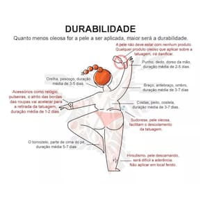 lave a posição do corpo que você quer colocar essa tatuagem temporária descubra a fita desta tatuagem temporária coloque o lado do adesivo com padrão na sua pele usando um pano molhado ou algo molhado para pressionar o adesivo você pode descobrir o adesivo para ver se o padrão está totalmente grudado no seu corpo, se não repetir o passo 4 descubra e termine a tatuagem. Marca: Não Informado