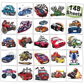 Seu filho quer uma tatuagem? Não precisa se preocupar, mãe! Estas são tatuagens temporárias removíveis para crianças! Com essas tatuagens falsas, seus filhos podem se enfeitar com desenhos coloridos que são lavados ou descascados mais tarde. Divirta-se com nossa coleção de tatuagens removíveis e temporárias para crianças. Características: Tatuagens temporárias CHARLENT 148 peças de carros de corrida e Monster Truck embaladas individualmente para lembrancinhas infantis.